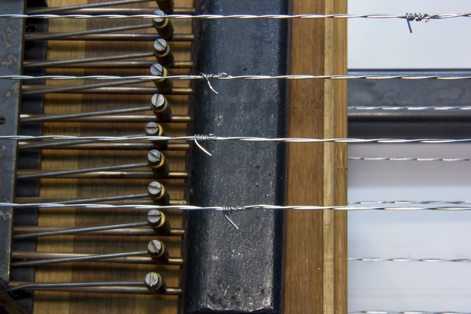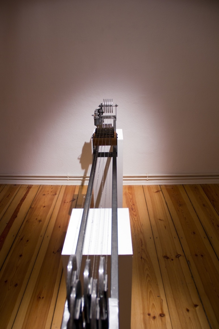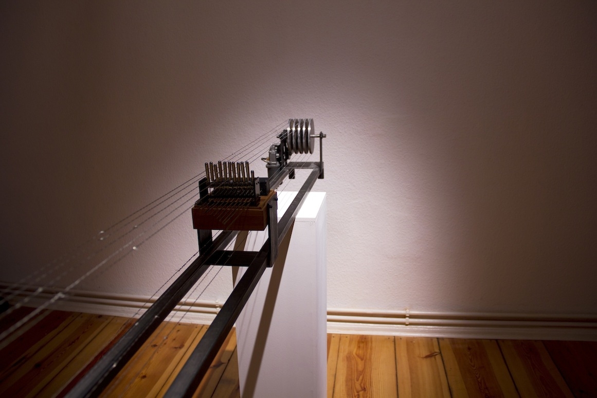 Each barb in each belt is a “note” in the music box, the distance between the barbs determines the rhythm and the relation between the barbs in the 5 belts composes the music of the piece.