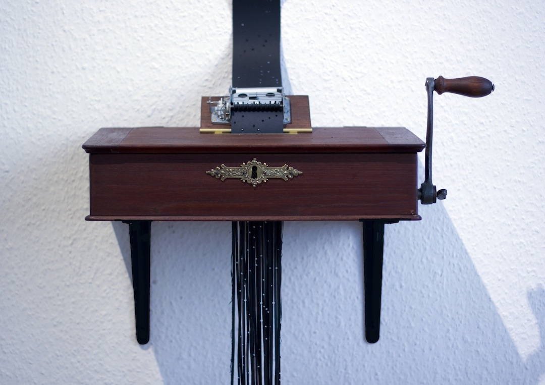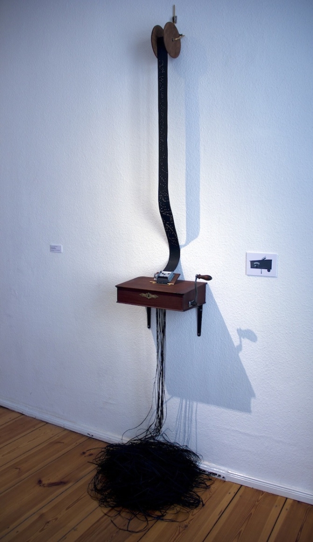 Vanishing Music refers to the deep interconnection of music as intangible matter and the source of the music, tangible material.At the very moment of sounding, the perforated paper, as the material carrier of the composition, score and source at the same time, is destroyed and emerges again, cut up in pieces on the floor. The music cannot exist here outside of the physical space of the work itself: its becoming and being is coupled to this object. The pile of remnant strips on the floor thus becomes a reminder of the physical fixedness of the sound that should not be overlooked.